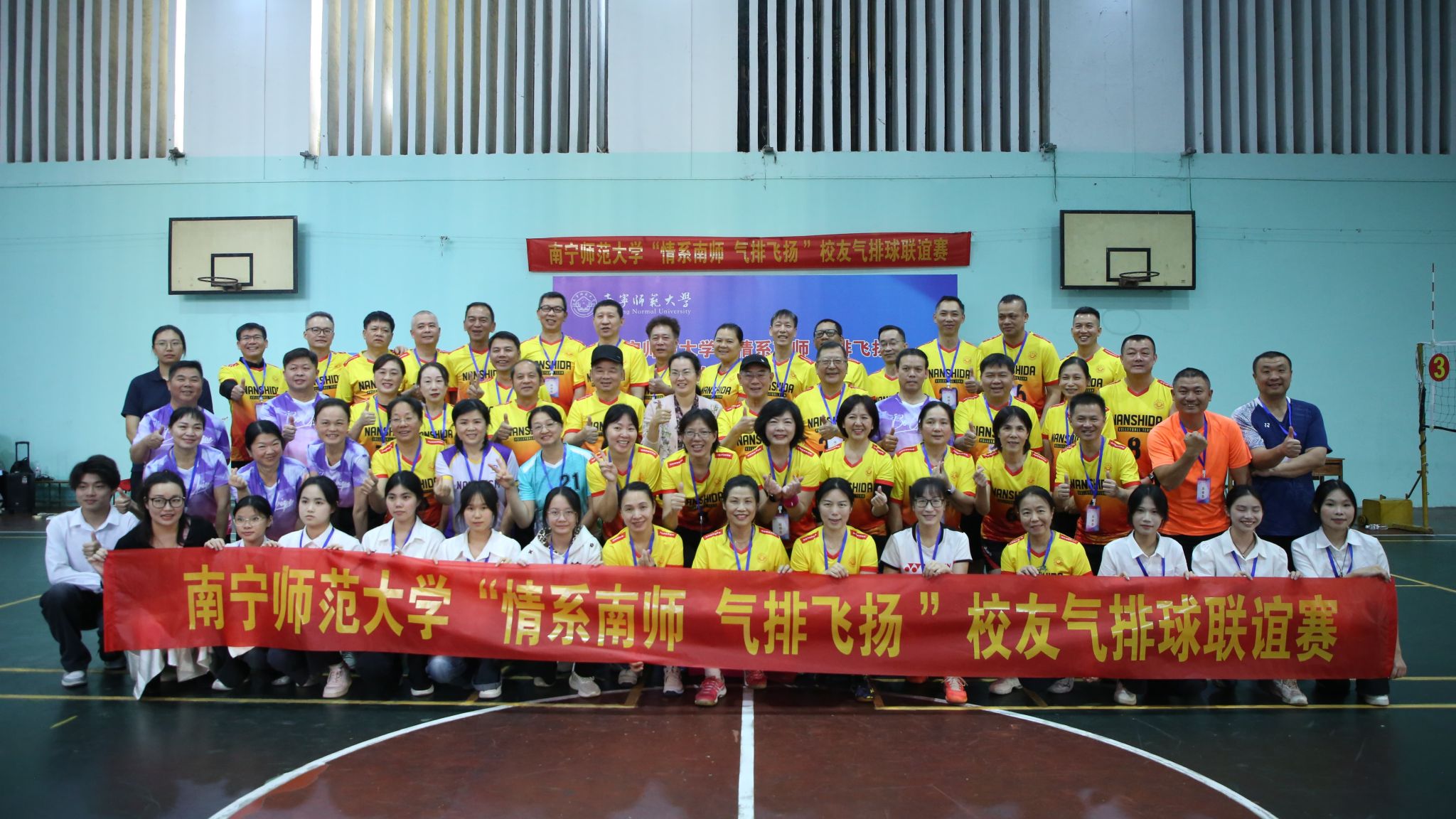 为进一步加强校友与母校的情感联结,搭建交流互动平台,营造和谐校园氛围,11月29日,由国内合作处(校友工作办公室)、校团委和体育与健康学院联合主办,南宁、崇左校友联络处承办的南宁师范大学“情系南师、气排飞扬”校友气排球联谊赛在明秀校区体育馆进行。本次比赛共有校友及教职工组成的9支队伍、53名选手参赛。